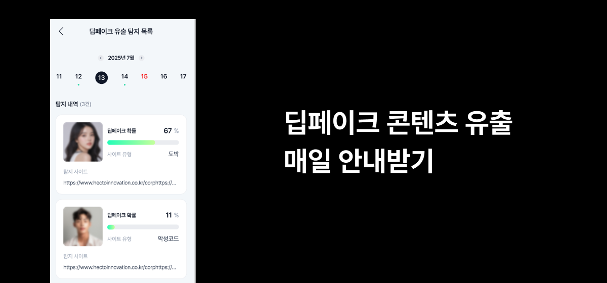 나도 모르는 곳에서 유출되고 있는 나와 유사한 딥페이크 콘텐츠를 한눈에 확인할 수 있어요. 프로필 사진을 등록하고 매일 유출 여부를 확인해보세요.