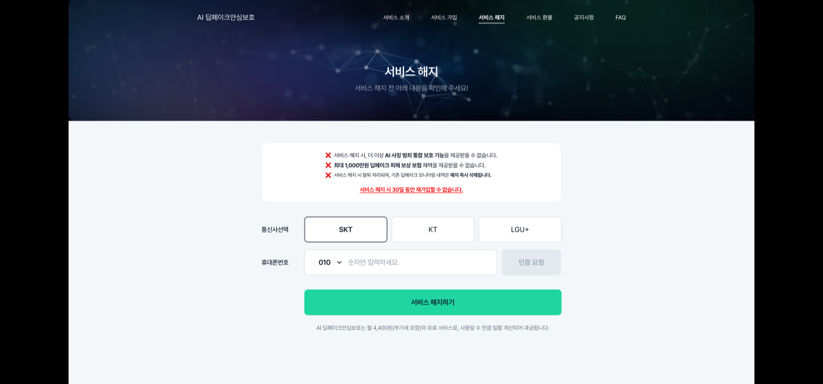 - 딥페이크안심보호 서비스는 가입한 당일 해지할 경우 별도의 요금이 발생하지 않습니다.