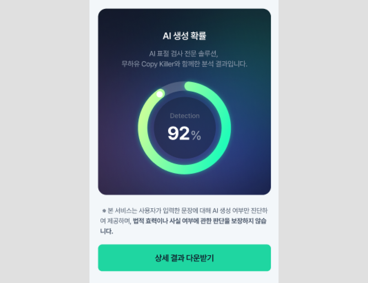 딥페이크안심보호의 AI 작성 진단 기능은 작성한 문장을 분석하여 문장 내 AI가 작성한 것으로 의심되는 비중을 데이터로 제공하며, 문장 내 어떤 부분이 AI 작성으로 의심되는지 리포트로 제공합니다. 해당 기능은 무하유 카피킬러와 함께 분석하여 제공합니다.