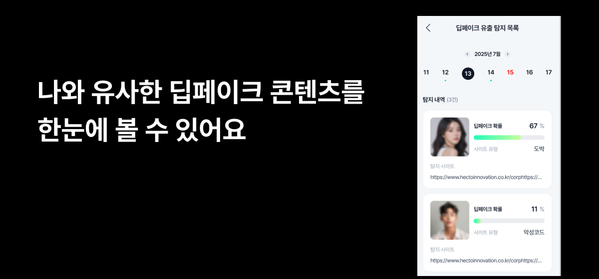 딥페이크안심보호는 딥페이크 모니터링 및 진단, AI 작성 진단, 딥페이크 피해 보상 등 AI 악용 범죄 대비를 도와주는 다양한 기능들을 제공하고 있습니다.